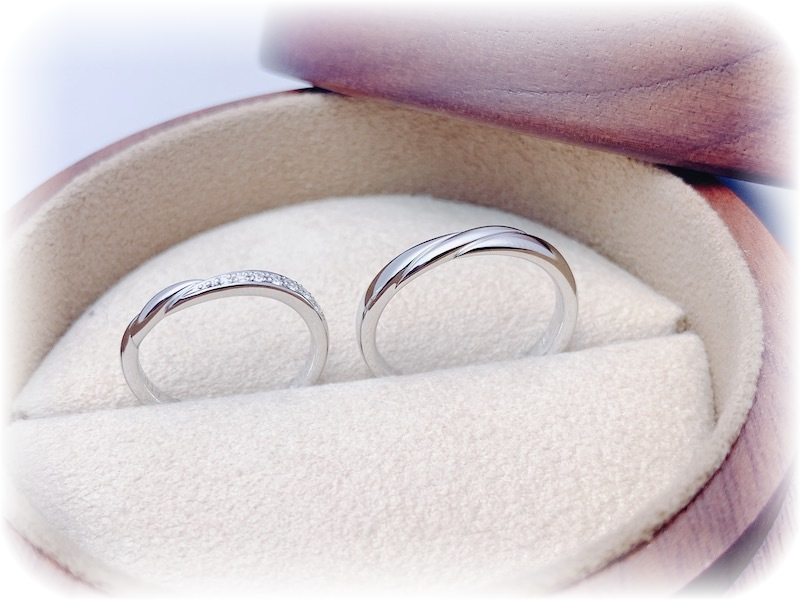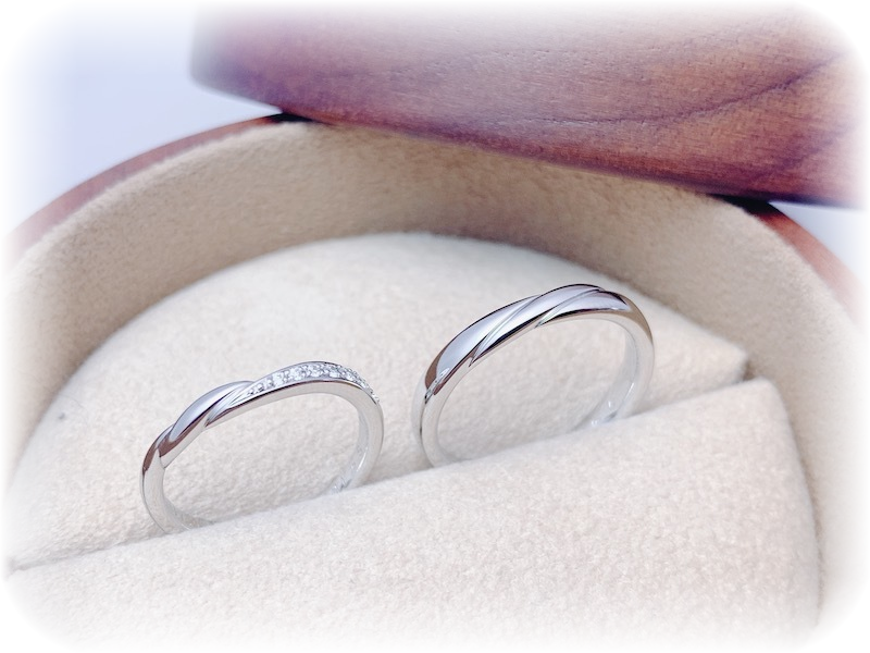 「結婚指輪は、どのような指輪を選んだら良いかわからないまま、いろいろなジュエリーショップに行って見比べています。どれも似たようなデザインばかりで。どれを選んだら良いか悩んでいます。」と、来店予約でご相談されてから、お二人でご来店されました。