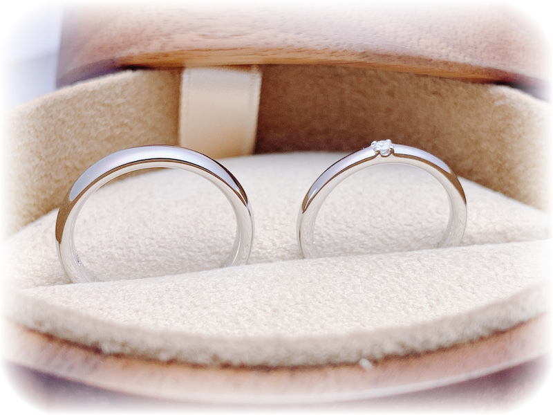 出来上がりをご覧になって「綺麗だし、細身でシンプルなんだけどこのしっかり感は素晴らしいですね。変形する気がしません。丈夫そうです。これならずっと結婚指輪をつけられますね。友人にもこのコラニーを見せて買い換えるように伝えようかな(笑)」と、喜んで頂きました。
