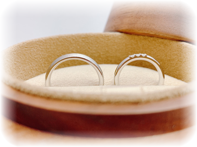 「結婚指輪はシンプルなデザイン、細身のデザインを探しています。でもあまり華奢な指輪だと壊れたりしないか心配です」と、ジュエルミキの来店予約をされてからお二人でご来店されました。
