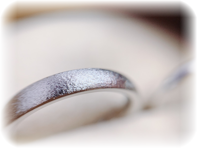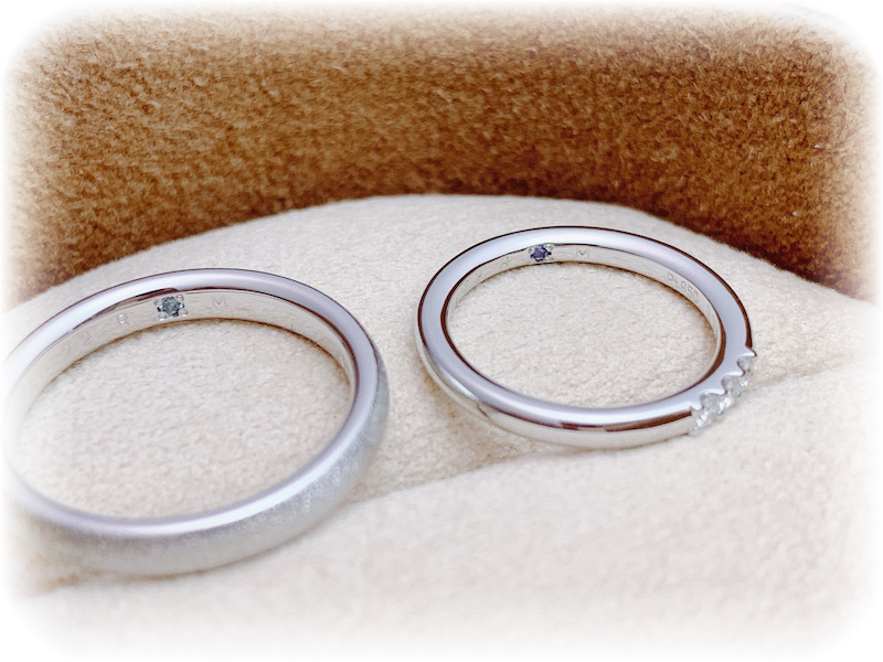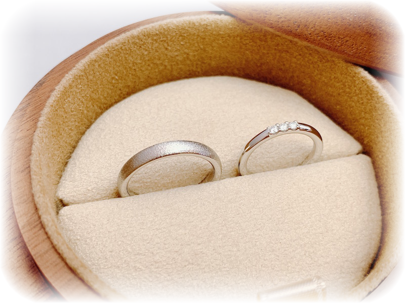 出来上がりをご覧になり「つや消しもかっこいいし、ダイヤモンドもキラキラ綺麗です。コラニーの結婚指輪に決めてよかったです。ありがとうございました」と、喜んで頂きました。