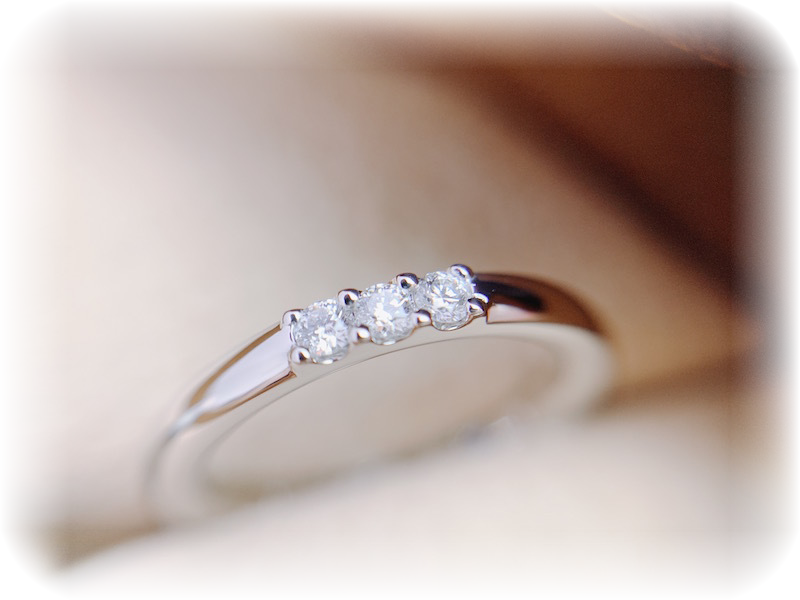 レディースはダイヤモンドを3石オプションでセッティングしました。シンプルながらこのダイヤモンドが存在感をしっかり出しています。キラキラと綺麗に輝いてるのが特徴です。