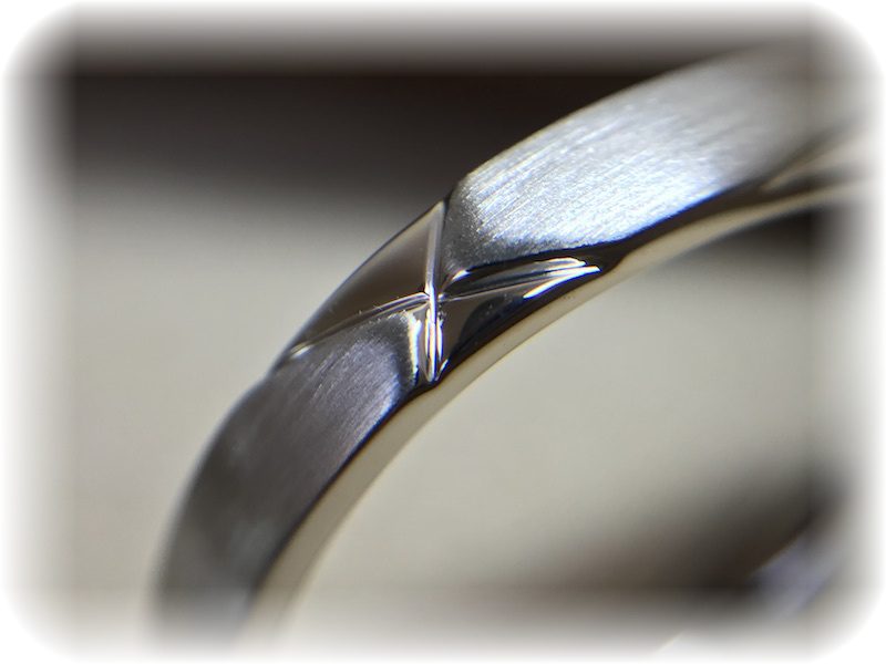 メンズはシンプルで細身なデザインながらも、表面は個性的なデザインを施しています。コラニー独特のつや消しの美しさは、実際にご覧になって頂きたいです。我々プロの目から見ても、素晴らしい技術力を施したマリッジリングとなっています。