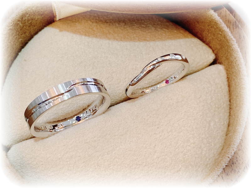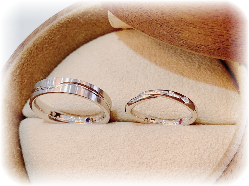 出来上がりをお二人でご覧になって「ありきたりじゃないデザインの結婚指輪を購入することができました。指輪の内側にも誕生石と名前を刻印してくれてありがとうございました」と、喜んで頂きました。