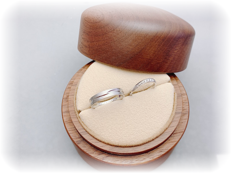 出来上がりを二人でご覧になって「プラチナの質感がいいですね。指輪の内側も滑らかでとてもつけ心地がいいです。コラニーの結婚指輪に決めて正解でした。ありがとうございました」と、喜んで頂きました。