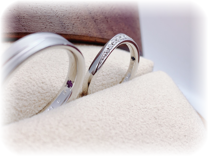 指輪の内側にはお互いの誕生石である「アメジスト」と「ダイヤモンド」を埋め込みました。記念日とお名前も刻印しました。
