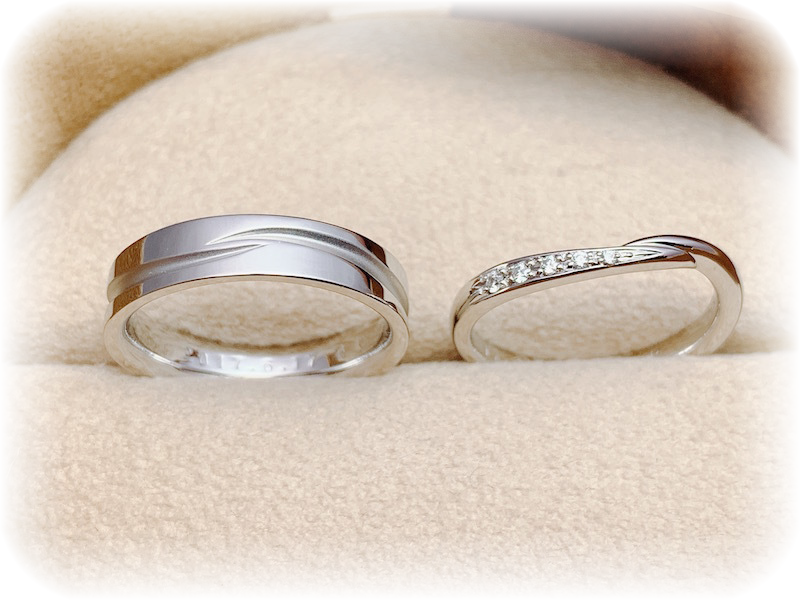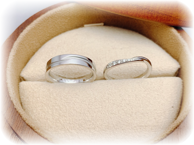出来上がりをご覧になって「私たちの指にぴったりのデザイン、そしてぴったりの0.25号刻みのサイズのマリッジリングをオーダーメイドしてくれてありがとうございました。こんなに素敵な結婚指輪を購入できるなんて、期待以上でした。ずっとずっと大切につけていきます」と、喜んで頂きました。