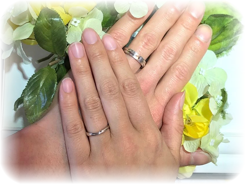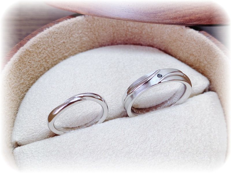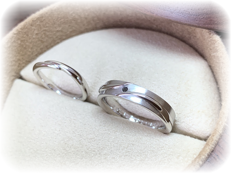 出来上がりをお二人でご覧になって「俺のカッコイイっすね!気に入りました」「私もシンプルだけどウェーブラインがかわいいです」と、喜んで頂きました。