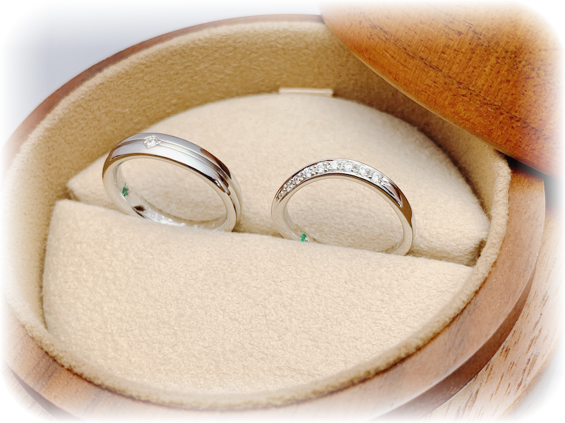 指輪の内側にはお二人の誕生石であるエメラルドを埋め込みました。