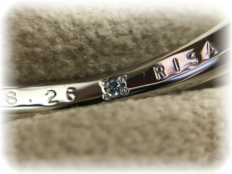 指輪の内側にはお二人の結婚記念日である「8月26日」を刻印しました。その隣にはお二人の誕生石も埋め込みました。誕生石は守護石でもあります。お二人のお守りになりますね。