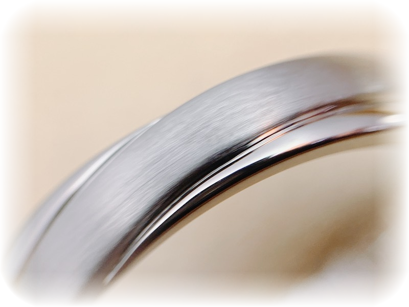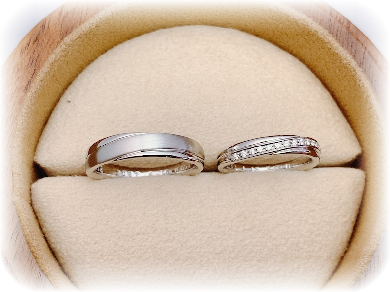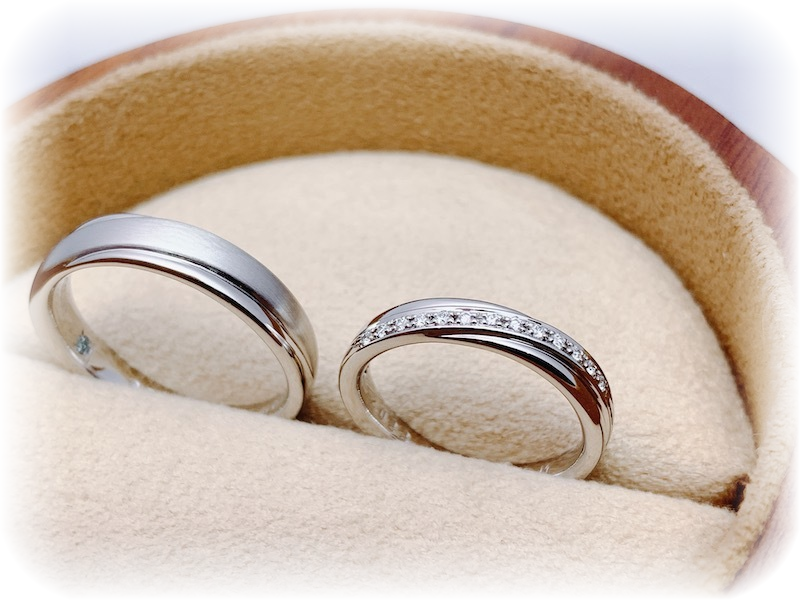 メンズは表面を艶消しにカスタマイズした、世界で2人だけのオリジナルオーダーメイドマリッジリングの完成です。