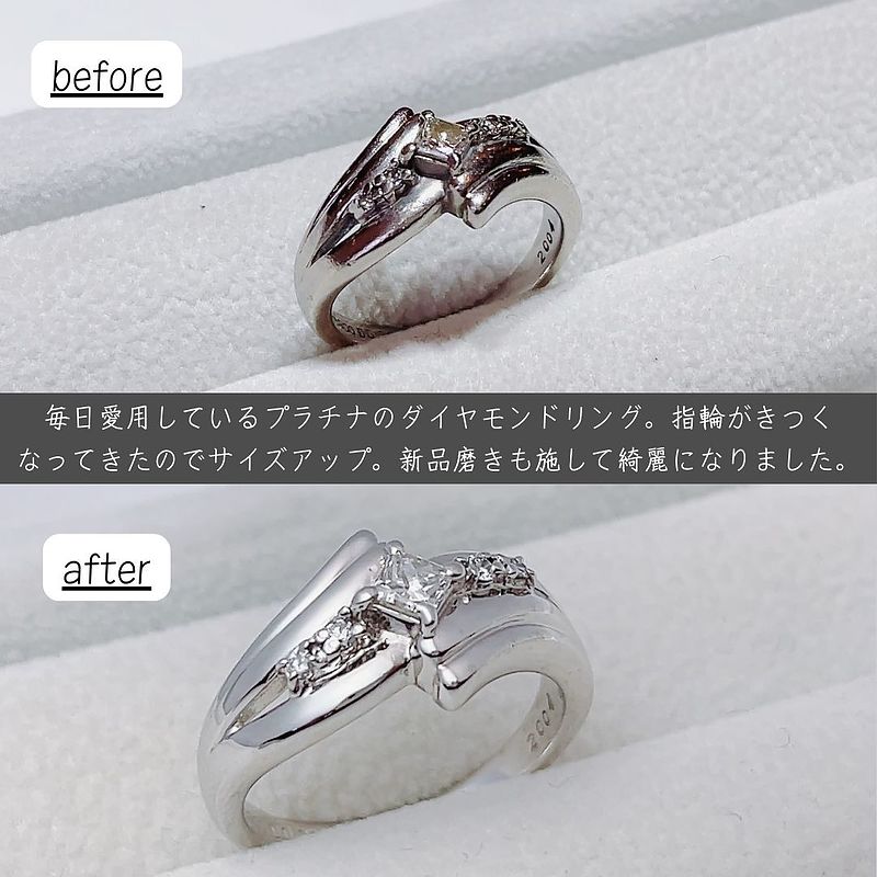 指輪がキツくなってきたのでサイズアップ修理をお願いしました。新品同様にピカピカになって戻ってきました。とても嬉しいです。