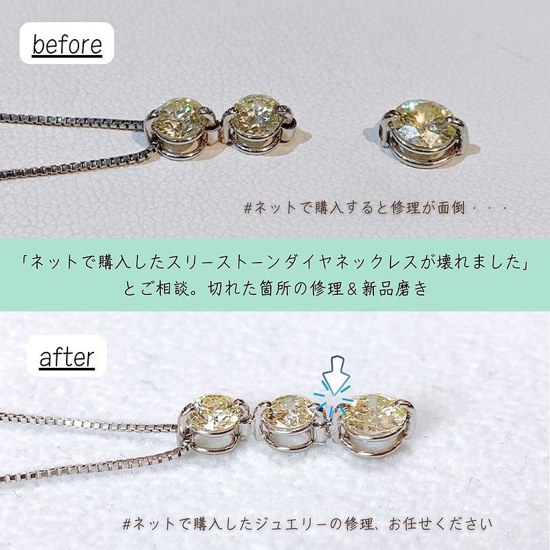 ネットで購入した3ストーンネックレスですが、買ったショップに修理依頼すると発送したりやりとりしたりが面倒だったので大分市内でちゃんと修理してもらえる宝石店を探しました。ジュエルミキで綺麗に修理してもらって助かりました。