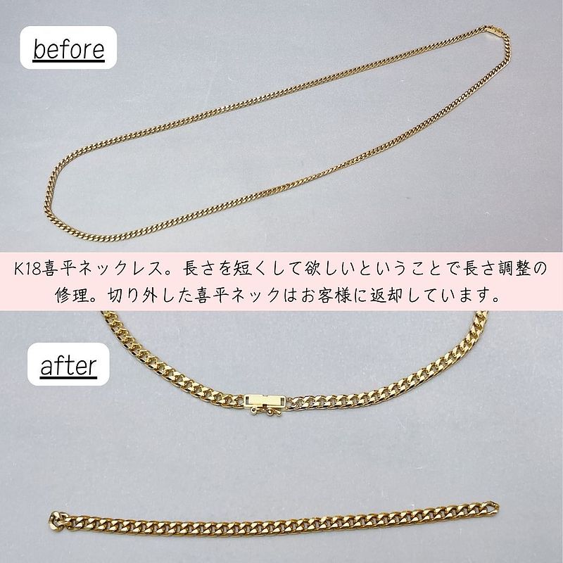 K18喜平ネックレスの長さ調整修理。お客様の首回りに合わせて約5cmカットしました。カットしたチェーン部分はお客様に返却しました。