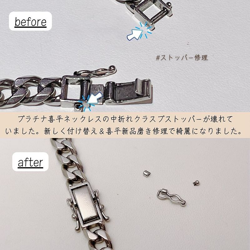 長く着けてきた喜平ネック、留め金が壊れてしまいました。きちんと修理してもらってよかったです。全体も綺麗に磨いてもらってまるで新品のように甦りました。