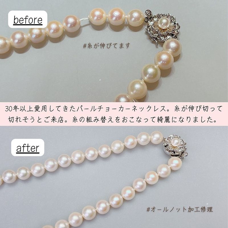 ジュエルミキの数あるジュエリー修理の中で、パールチョーカーネックレスが切れた・糸替え・留め具交換・長さ調整などの修理事例をご紹介いたします。