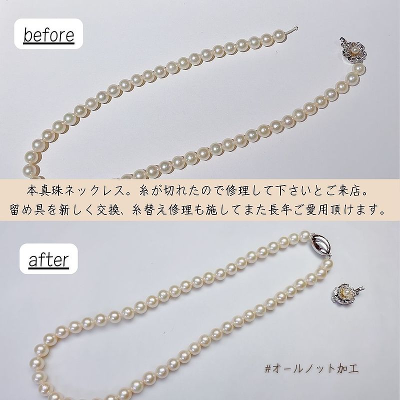 パールネックレスが突然切れてしまってお困りのお客様。ジュエルミキできちんと修理させていただきました。