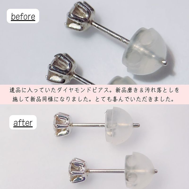 母の遺品に入っていたダイヤモンドピアスです。生前いつもつけていました。娘の私がこれからつけようと思ったんですが、汚れがひどかったので綺麗に修理してもらいました。嬉しいです。