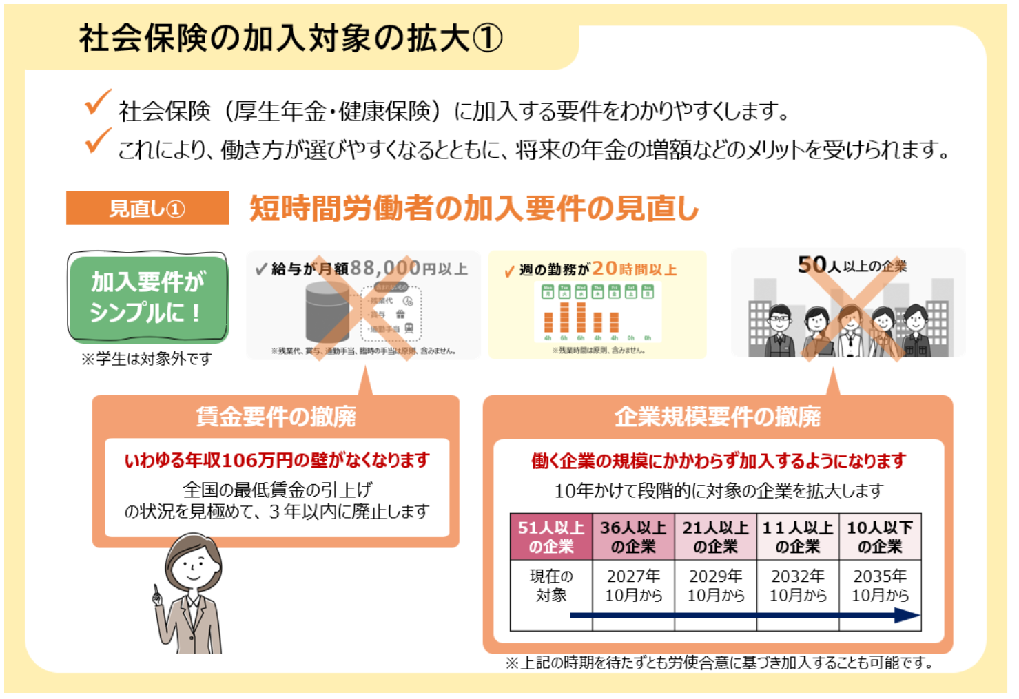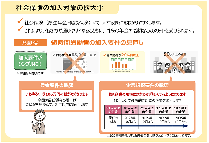 もともと、従業員51人以上となっていた企業規模要件も、2027年10月から段階的に引き下げ、2035年10月に撤廃。