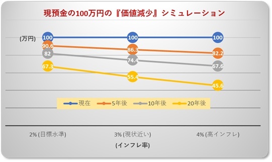 仮に、物価上昇率が年2%で10年間続いた場合、100万円の預金の実質的な価値は、約82万円相当まで下がります。
