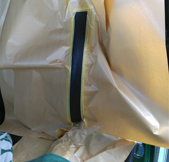 黒の艶消しに色違いのステッチ、塗装で染まらないようマスキングにて対応
