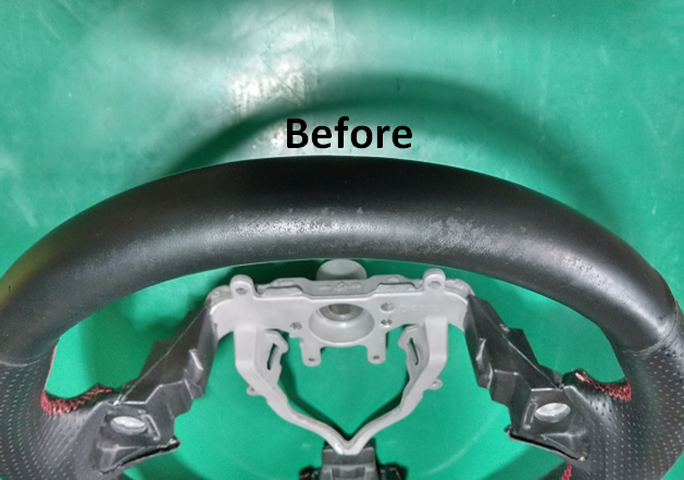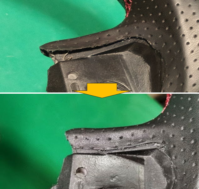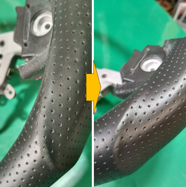 実はこれまでパンチングレザーのステアリングの補修はお断りしていました。というのも、「補修中にパンチングの穴が埋まってしまいます。最終的にこの埋まった穴の再生が必要です。シートのような中が柔らかな素材は穴の再生はし易いすいのですが、ステアリングのような芯の硬い物の穴の再生は無理」との判断からです。