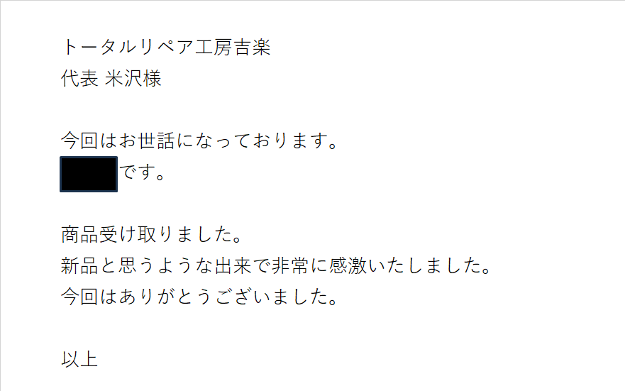完成したステアリングを受け取られたお客様より下記のメールをいただきました。