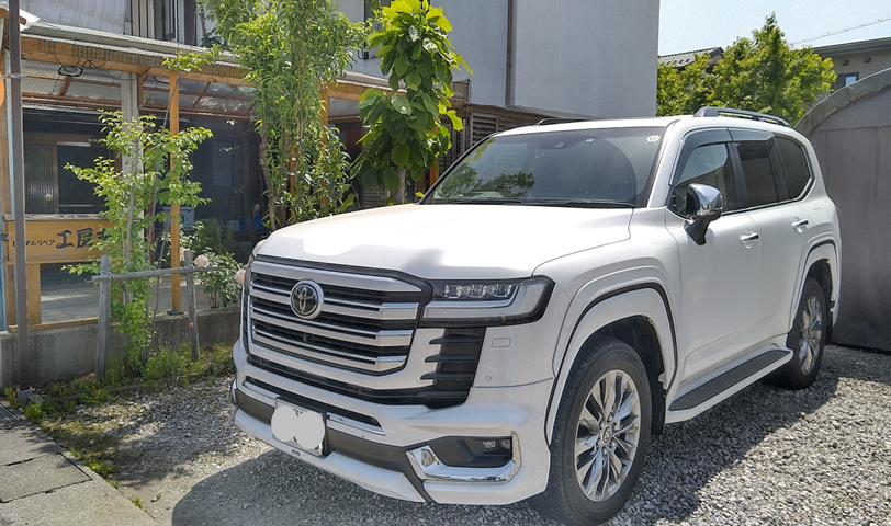 それにしてもランドクルーザーってこんなに大きかった?補修する車はいつものカーポート側に入れるのですが、トラブルになったらいやなので、駐車場側で後頭部に陽射しを受けながらの施工を選択いたしました。