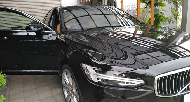 当日約束の9時に現れてたVOLVOは新車見間違えるほどきれいな車両です。奥様と2台の車で来られ、VOLVOを預けて一旦帰られるようです。傷の方ですが、かなりの衝撃がかかったように見うけられるので、お客さまには「補修痕は残ると思います。」と伝えました。