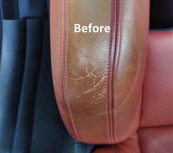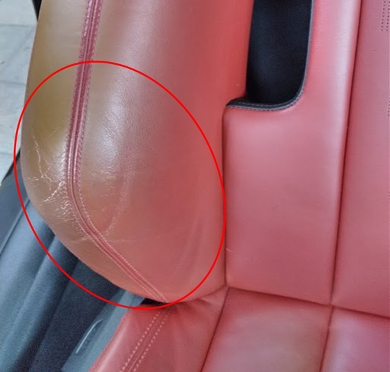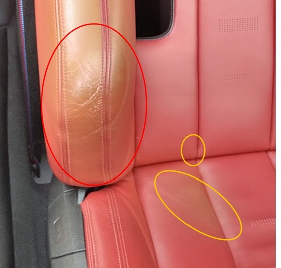 写真の背もたれサポート部の色がだいぶ色あせ、黄ばんだ色をしています。乗り降りで一番当たる箇所は深めの擦れ・しわも寄っています。赤線で囲んだ部分がお客様から依頼のあった箇所ですが、それ以外の座面部分の黄線部も変色が出ています。