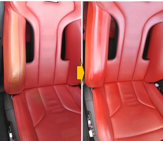 作業はクリーニング、脱脂完了後、擦れシワ部分をサンダーで表面を削って行きます。黄ばみの原因が日焼による変色であるなら、削ることで変色部は、革本来の薄茶色が出て来るはずですが、出てきたのはきれいな赤でした。シートの変色は日焼が原因ではなく、表面に何かが付着して黄ばんでしまっています。ただこの黄ばみは、かなり強い溶剤でも落ちませんまん。削り取るしかありませんが、補修するサポート部の両側はステッチがあるため、すべて削りとり元の色に復活するのは不可能です。表面の高さをほぼ合わせた状態から塗装に入るとにしました。