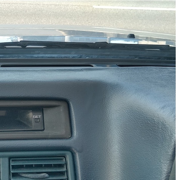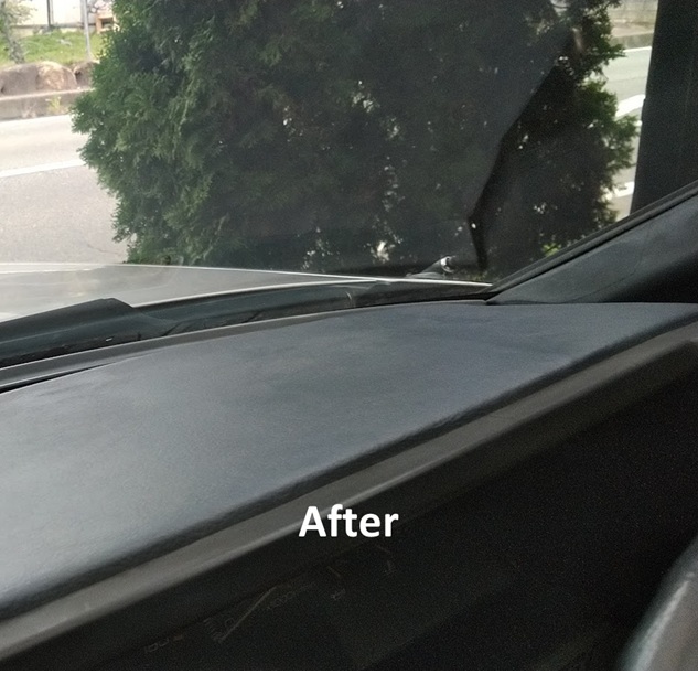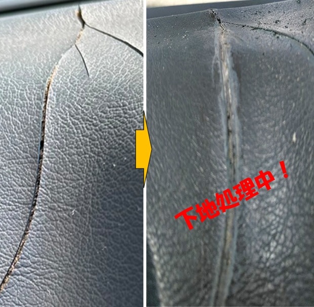 施工当日ダッシュボードを触ってみると、どう見てもプラスチックです。しかもプラスチックの厚さは1ミリにも満たない薄さです。通常プラスチックのダッシュボードは数ミリの厚みがありす。この厚みがあるからリペアに耐えられます。こんな薄いプラスチックでは接着してもすぐに割れてしまいます。一瞬目の前が真っ暗になってしまいました。がしかし、その下にウレタンスポンジがあります。表皮当たるプラスチックは薄いが、構造はウレタンレザーと同様の構造です。