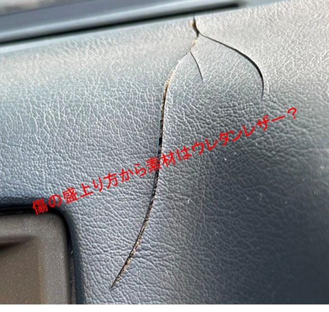 傷口をドアップにしてみると傷自体上方向に盛り上がっています。ダッシュボードの素材はプラスチックと高級車に多いウレタンレザーがありますが、この盛り上がり方はウレタンレザーの特徴です。レビンにウレタンレザー使うのか?と疑問が湧きましたが、とりあえずウレタンレザーでの施工を想定しました。