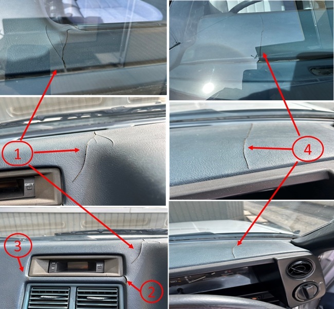 「旧車のレビンなんですが、ダッシュボードの傷補修できますか?」の問い合わせと供に6枚の写真が送られてきました。どの写真も大きな傷がこれでもかとダッシュボードに走っています。いったい何箇所傷があるんだ?と思い、送られた写真を編集しました。