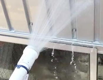 まず、外部から順番に少しずつ散水し、室内側に水が染み出すタイミングを確認します。