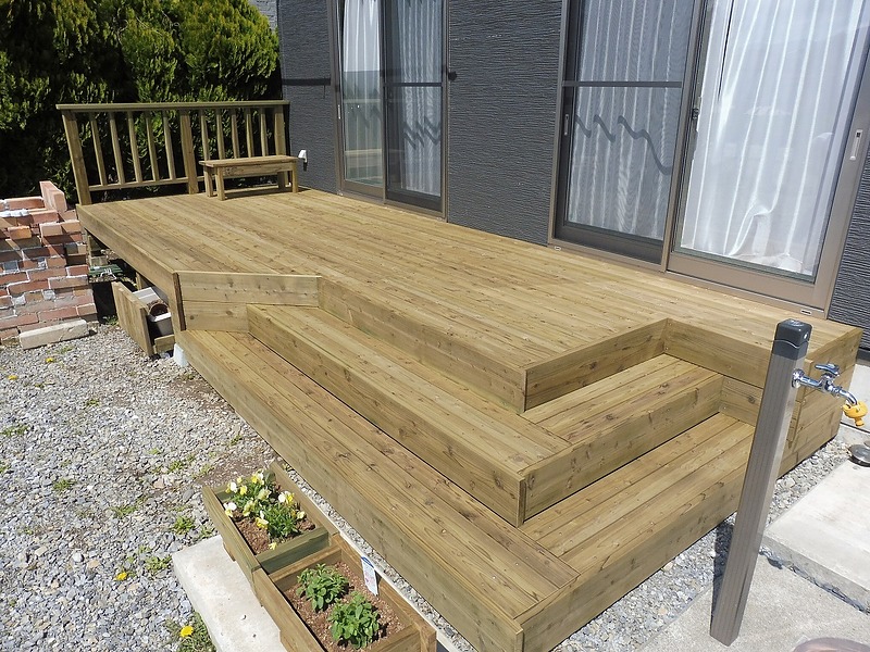 自社工場にて防腐処理された木材を使い、ウッドデッキ・フェンスなどの
