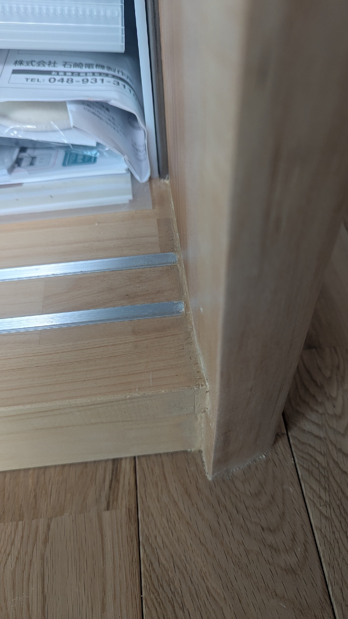 今日は長野で住宅無垢材据付キッチン収納の歪み、変形の隙間補修、リペアでした。