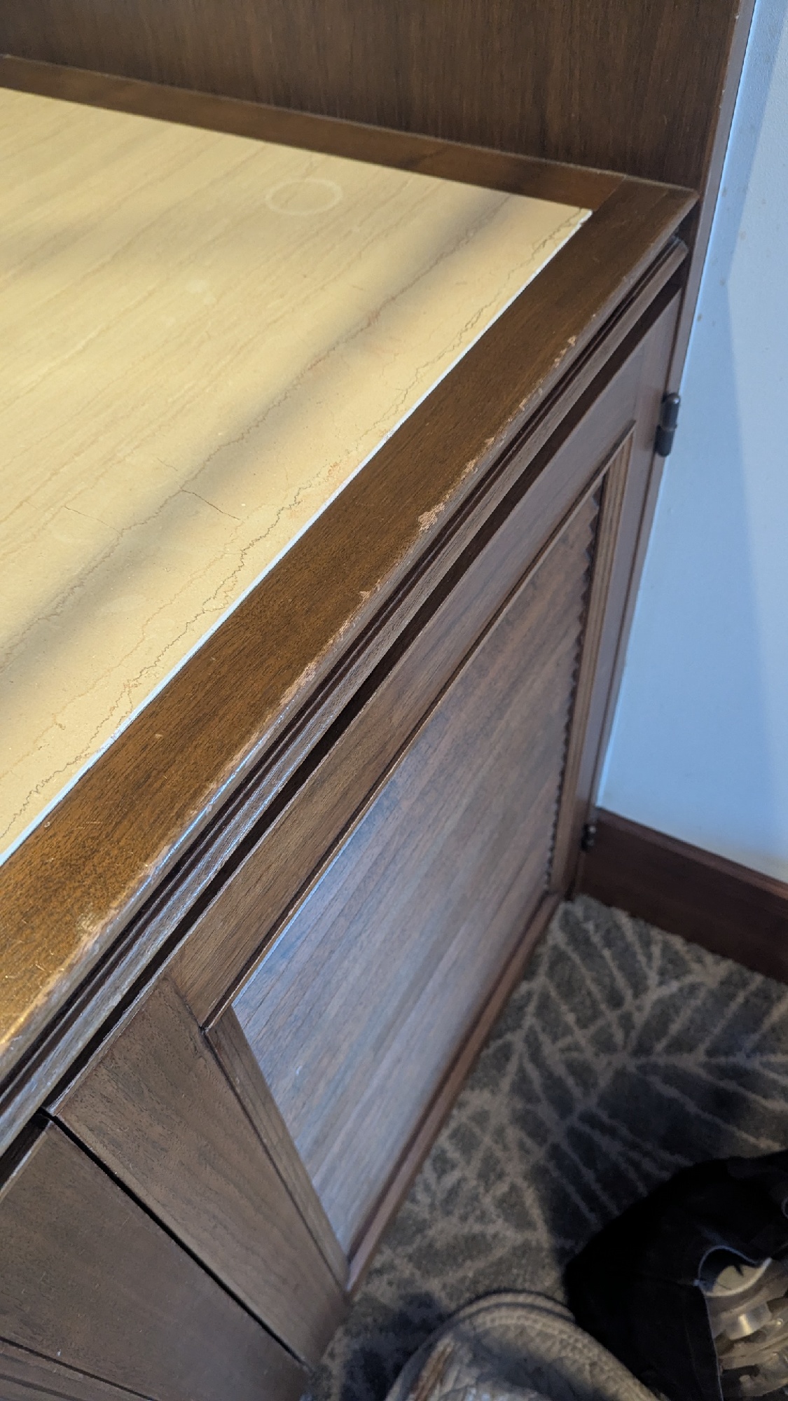 今日は長野でホテル収納棚天板のキズ、剥がれ補修、リペアでした。