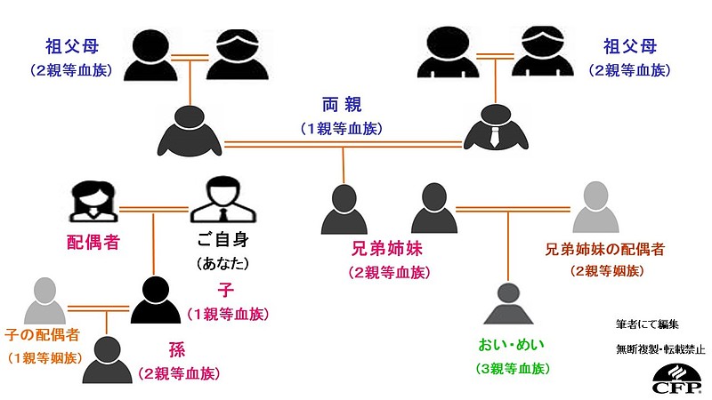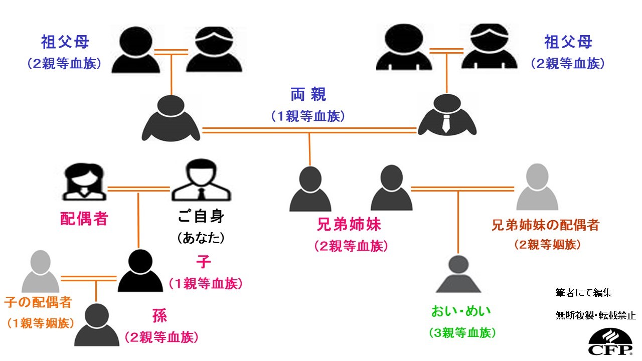 照会対象者の認知判断能力が認知症等により低下し、生命保険契約の存在が分からない場合『法定代理人 ; 任意代理人 ; 3親等内の親族(下図参照)などが保険加入状況を照会』可能です。申請の際『照会者の本人確認書類 ; 協会指定の診断書』などの添付が必要となります。