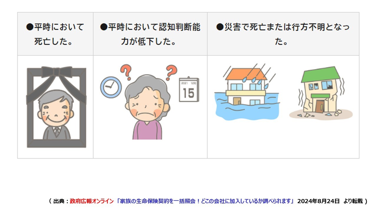 万が一死亡・病気・けが・介護など人生の不測の事態に備え、生命保険に加入している人は多いでしょう。しかし、突然『家族や兄弟姉妹が亡くなった』『親が認知症になった』..その際『どの生命保険会社に、どんな生命保険の契約があるかわからない』と保険金や給付金が請求できないことも…。