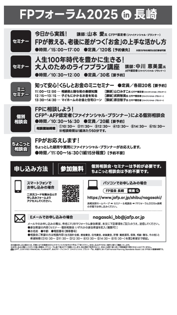 【主催】特定非営利活動法人(NPO法人) 日本ファイナンシャル・プランナーズ協会 長崎支部 (後援 ; 金融庁・消費者庁・金融経済教育推進機構(J-FLEC)・長崎県・長崎市・長崎県金融広報委員会)