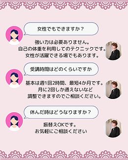 よくあり質問をまとめてみました。【女性でもできますか?】強い力は必要ありません。自己の体重を利用してのテクニックです。女性が活躍できる場でもあります。【受講時間はどのくらいですか】基本は週1回2時間、最短4か月です。月に2回しか通えないなど調整できますのでご相談ください...