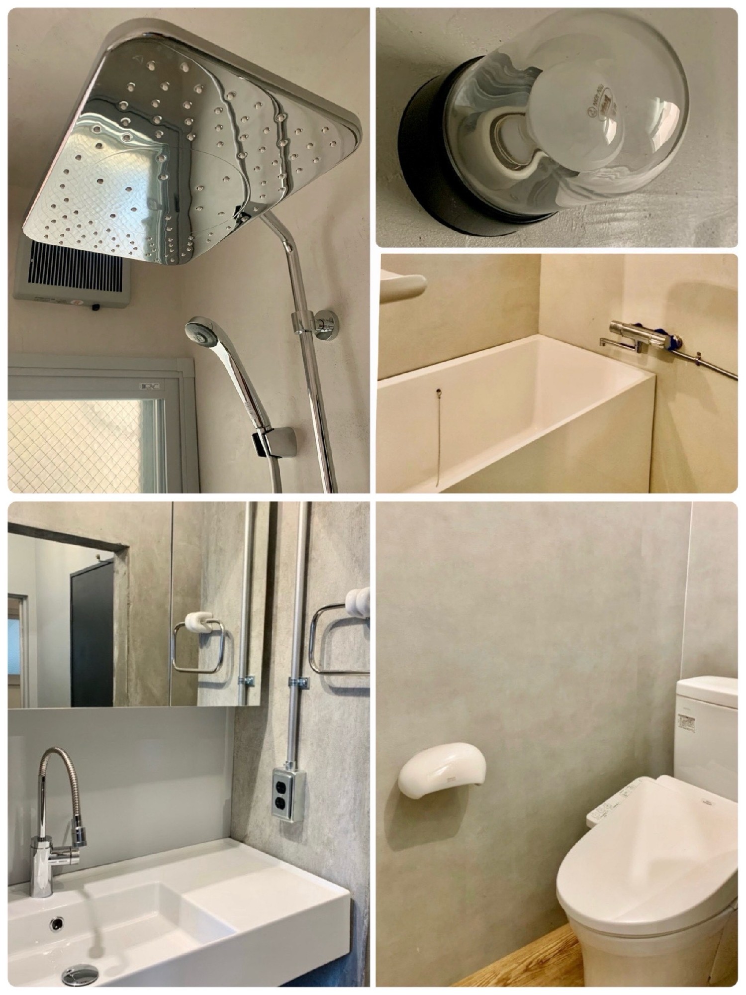 ・ベルギーの左官材で、浴室の天井と壁面をコンクリート調とした。