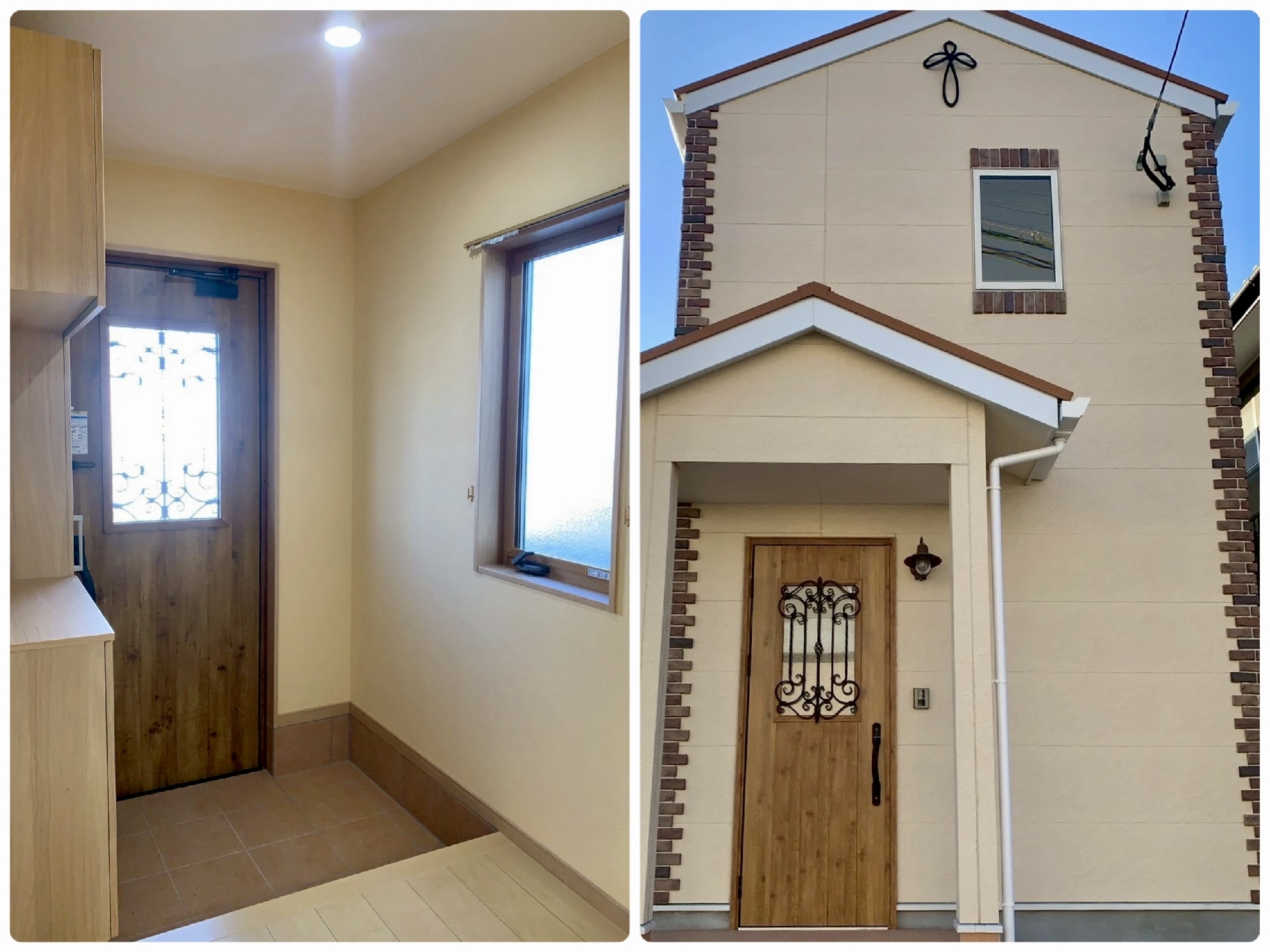 (=^▽^)σ「玄関ホールのテラコッタ調タイル、玄関ドアや照明のアイアン、外観アクセントの