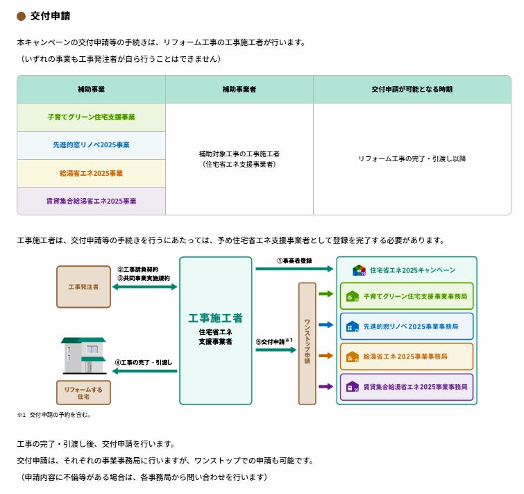 - 工事完了後、施工業者が「住宅省エネポータル」を通じて補助金の交付申請を行います。