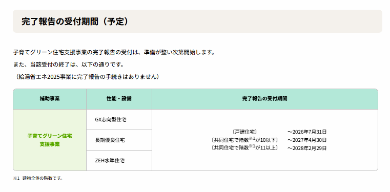 - 子育てグリーン住宅支援事業の新築の場合など、補助金交付後にも住宅の引渡しと入居を報告する「完了報告」が必要となる場合があります。