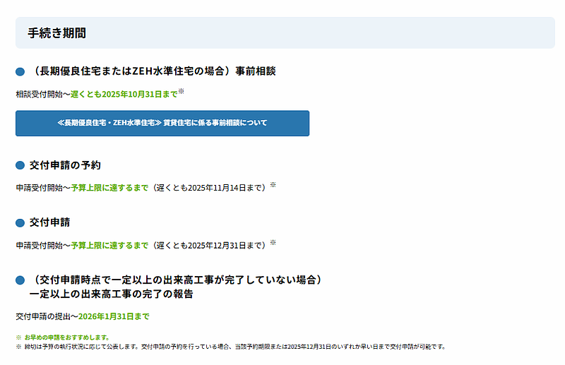 - 申請可能な戸数制限: 長期優良住宅またはZEH水準住宅の場合、該当住宅総数の50%以内に補助対象戸数が制限されることがあります。