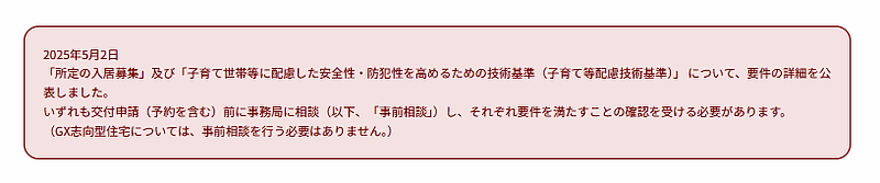 「所定の入居者募集」及び「子育て等配慮技術基準」について、申請前に事務局と「事前相談」を行う必要があります。