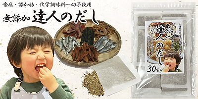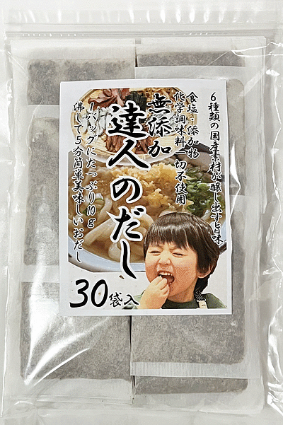 国産6種原料が醸し出す旨味。食塩・添加物・化学調味料不使用。達人のだし