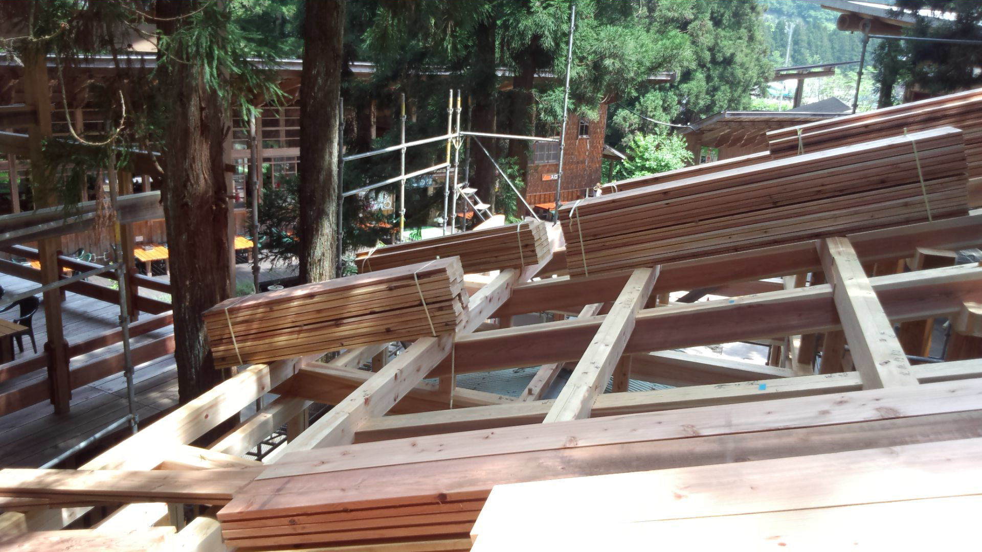 厚さ60mmに及ぶ国産木材の屋根板を敷いています。