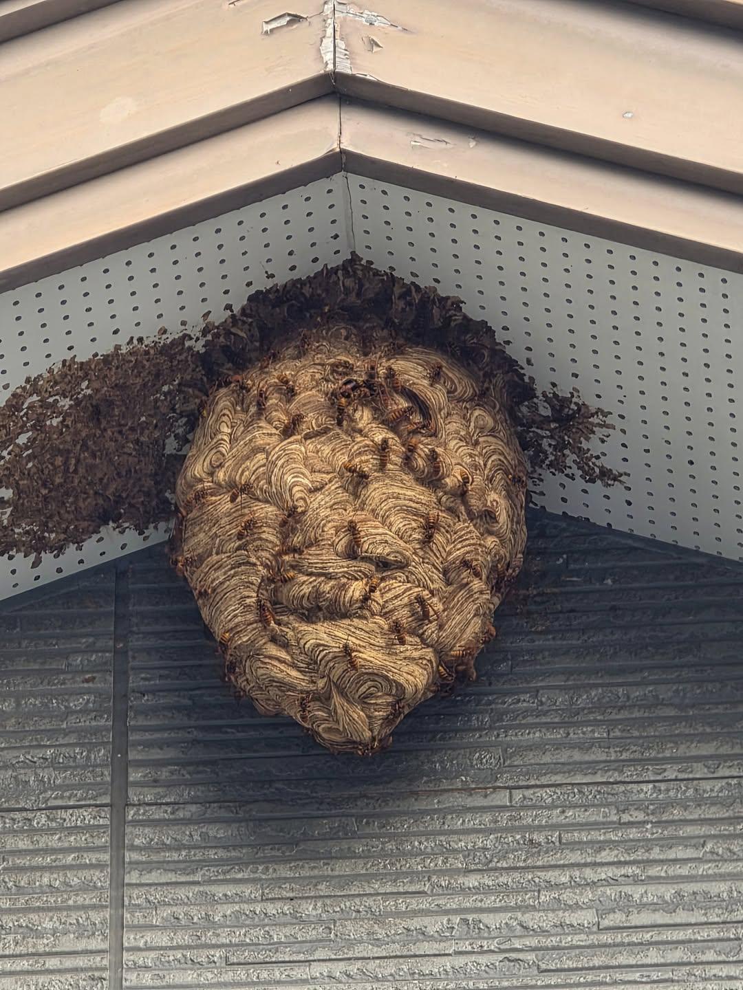 スズメバチは非常に攻撃的で、毒も強いため、特に駆除には細心の注意が必要。